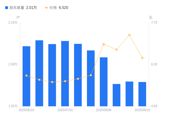 近一年(2024年9月20日至2025年9月19日),ST先河A股股东户数从3.15万户,减低至2.01万户,降幅36.19%,区间股价上涨76.69%。