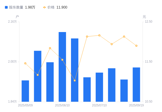 近一年(2024年9月30日至2025年9月19日),招商积余A股股东户数从2.47万户,减低至1.98万户,降幅19.81%,区间股价上涨14.98%。