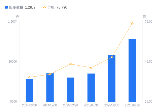 近一年(2024年9月30日至2025年9月19日),皓元医药A股股东户数从7855户,增加至1.28万户,增幅63.37%,区间股价上涨165.91%。