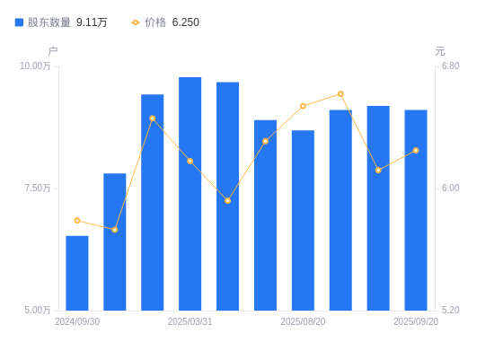 近一年(2024年9月30日至2025年9月20日),远光软件A股股东户数从6.53万户,增加至9.11万户,增幅39.52%,区间股价上涨17.92%。