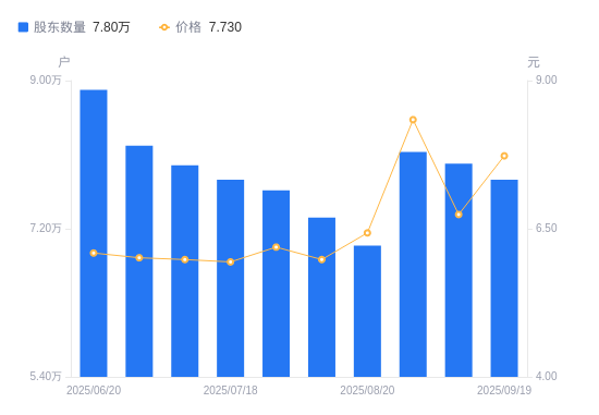 近一年(2024年9月30日至2025年9月19日),友阿股份A股股东户数从4.63万户,增加至7.8万户,增幅68.33%,区间股价上涨198.46%。