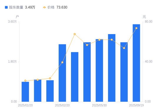 近一年(2024年9月30日至2025年9月19日),宏景科技A股股东户数从1.11万户,增加至3.49万户,增幅215.14%,区间股价上涨388.55%。