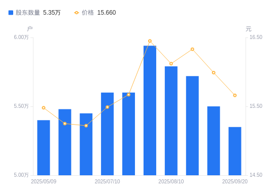 近一年(2024年9月30日至2025年9月20日),葵花药业A股股东户数从3.44万户,增加至5.35万户,增幅55.58%,区间股价下跌26.24%。