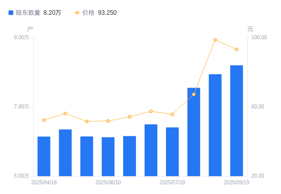 近一年(2024年9月30日至2025年9月19日),捷佳伟创A股股东户数从5.49万户,增加至8.2万户,增幅49.48%,区间股价上涨68.25%。