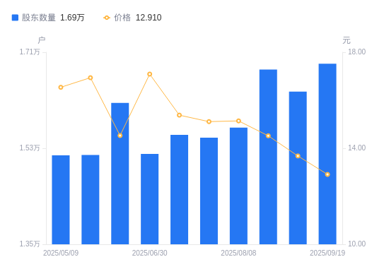 近一年(2024年9月30日至2025年9月19日),武汉天源A股股东户数从2.05万户,减低至1.69万户,降幅17.58%,区间股价上涨52.96%。