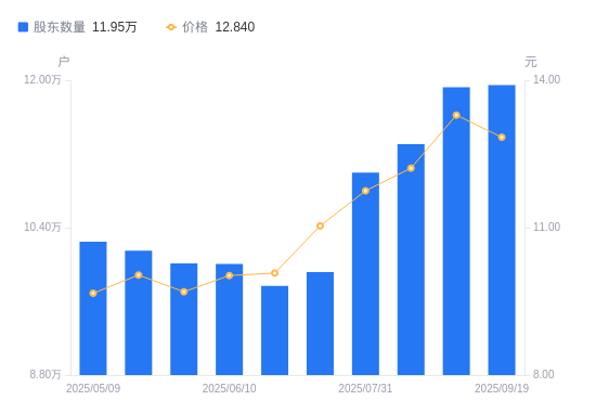 近一年(2024年9月20日至2025年9月19日),西藏珠峰A股股东户数从11.15万户,增加至11.95万户,增幅7.16%,区间股价上涨42.43%。