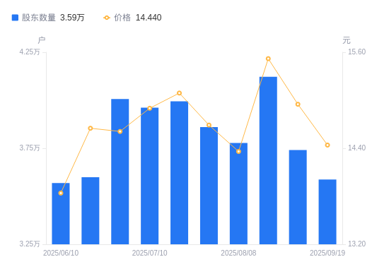 近一年(2024年9月20日至2025年9月19日),皇台酒业A股股东户数从3.48万户,增加至3.59万户,增幅3.11%,区间股价上涨41.71%。