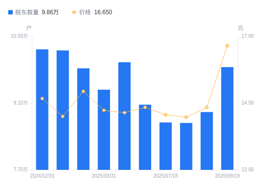 近一年(2024年9月30日至2025年9月19日),大港股份A股股东户数从9万户,增加至9.86万户,增幅9.52%,区间股价上涨34.93%。