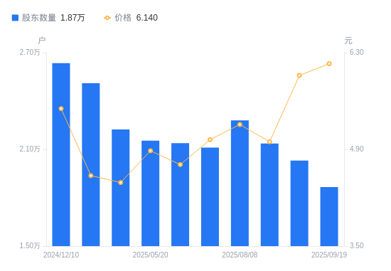 9月30日消息,数据显示,截至2025年9月10日,凯文教育A股股东总户数为2.03万户,较上期(2025年8月29日)减少1059户,降幅4.96%。公司最新A股总股本为5.98亿股,其中流通A股5.98亿股,户均持有流通A股数量为2.95万股,较上期增加1461.24股,增幅5.22%;户均持流通A股市值17.59万元,较上期增加3.56万元,增幅25.38%。