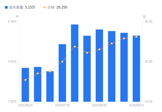 近一年(2024年9月30日至2025年9月19日),博腾股份A股股东户数从5.02万户,增加至5.15万户,增幅2.74%,区间股价上涨87.23%。
