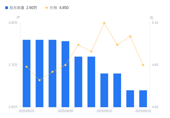 近一年(2024年9月20日至2025年9月19日),绿城水务A股股东户数从3.2万户,减低至2.6万户,降幅18.75%,区间股价上涨17.15%。