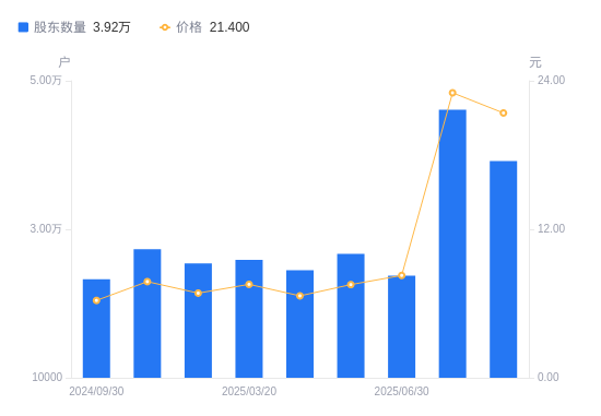 近一年(2024年9月20日至2025年9月19日),东杰智能A股股东户数从2.3万户,增加至3.92万户,增幅70.23%,区间股价上涨335.85%。