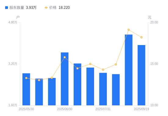 近一年(2024年9月30日至2025年9月19日),科创信息A股股东户数从3.19万户,增加至3.93万户,增幅23.32%,区间股价上涨54.80%。