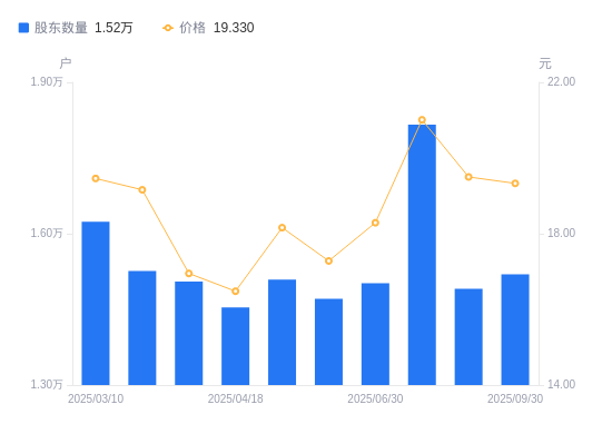 近一年(2024年9月30日至2025年9月30日),优德精密A股股东户数从1.63万户,减低至1.52万户,降幅6.98%,区间股价上涨35.46%。