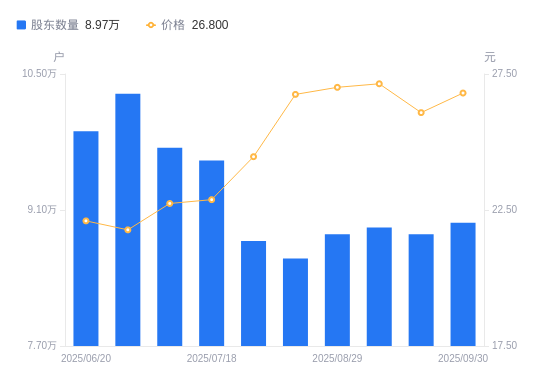 近一年(2024年9月30日至2025年9月30日),云天化A股股东户数从12.76万户,减低至8.97万户,降幅29.70%,区间股价上涨40.17%。