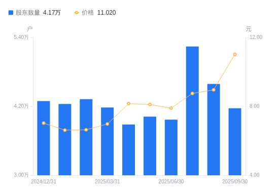 近一年(2024年9月30日至2025年9月30日),上峰水泥A股股东户数从4.84万户,减低至4.17万户,降幅13.95%,区间股价上涨65.96%。