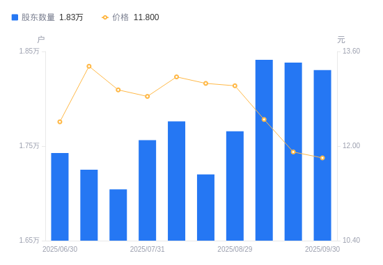 近一年(2024年9月30日至2025年9月30日),中原传媒A股股东户数从2.8万户,减低至1.83万户,降幅34.57%,区间股价上涨7.27%。