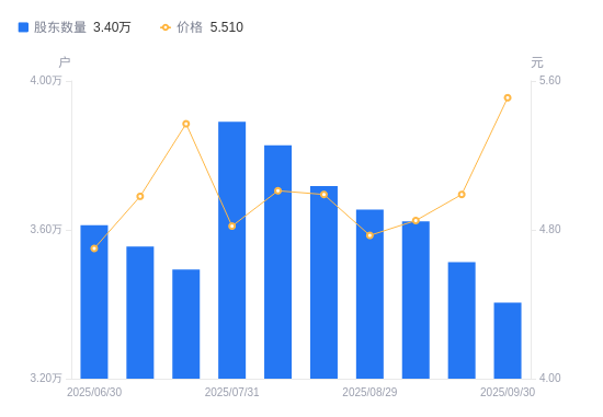 10月9日消息,数据显示,截至2025年9月30日,欣龙控股A股股东总户数为3.4万户,较上期(2025年9月19日)减少1089户,降幅3.10%。公司最新A股总股本为5.38亿股,其中流通A股5.38亿股,户均持有流通A股数量为1.58万股,较上期增加489.83股,增幅3.20%;户均持流通A股市值8.71万元,较上期增加1.07万元,增幅13.95%。