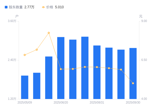 10月9日消息,数据显示,截至2025年9月30日,富煌钢构(维权)A股股东总户数为2.77万户,较上期(2025年9月19日)增加509户,增幅1.87%。公司最新A股总股本为4.35亿股,其中流通A股4.35亿股,户均持有流通A股数量为1.57万股,较上期减少292.87股,降幅1.84%;户均持流通A股市值7.85万元,较上期减少1.55万元,降幅16.50%。