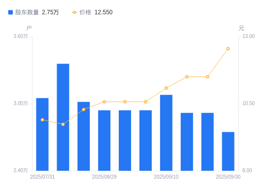 10月9日消息,数据显示,截至2025年9月30日,滨江集团A股股东总户数为2.75万户,较上期(2025年9月20日)减少1706户,降幅5.85%。公司最新A股总股本为31.11亿股,其中流通A股26.86亿股,户均持有流通A股数量为9.78万股,较上期增加5720.45股,增幅6.21%;户均持流通A股市值122.74万元,较上期增加16.85万元,增幅15.91%。