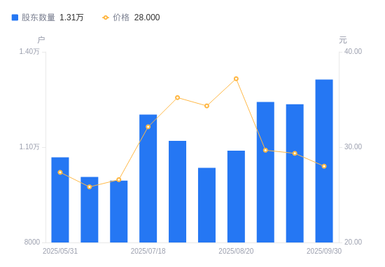 近一年(2024年9月30日至2025年9月30日),凯因科技A股股东户数从6716户,增加至1.31万户,增幅95.50%,区间股价上涨19.88%。