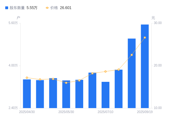 近一年(2024年9月30日至2025年9月19日),索通发展A股股东户数从3.41万户,增加至5.55万户,增幅62.61%,区间股价上涨131.90%。