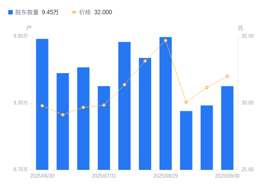 近一年(2024年9月30日至2025年9月30日),捷捷微电A股股东户数从7.44万户,增加至9.45万户,增幅27.03%,区间股价上涨53.48%。