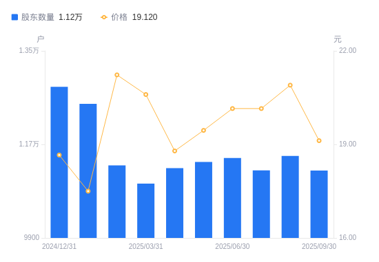近一年(2024年9月30日至2025年9月30日),田中精机A股股东户数从1.55万户,减低至1.12万户,降幅27.85%,区间股价上涨2.30%。