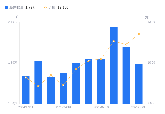 10月9日消息,数据显示,截至2025年9月30日,华新环保A股股东总户数为1.79万户,较上期(2025年9月10日)减少1224户,降幅6.39%。公司最新A股总股本为3.03亿股,其中流通A股1.68亿股,户均持有流通A股数量为9399.49股,较上期增加530.48股,增幅5.98%;户均持流通A股市值11.4万元,较上期增加1.34万元,增幅13.26%。