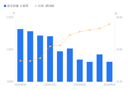 近一年(2024年9月30日至2025年9月30日),洁美科技A股股东户数从1.74万户,减低至1.31万户,降幅24.48%,区间股价上涨80.90%。