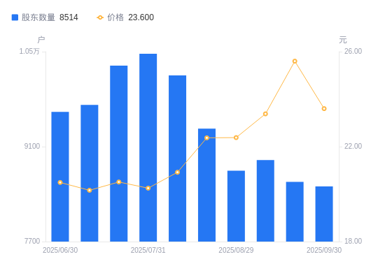 近一年(2024年9月30日至2025年9月30日),开润股份A股股东户数从6587户,增加至8514户,增幅29.25%,区间股价上涨10.87%。