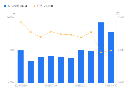 近一年(2024年9月30日至2025年9月30日),真爱美家A股股东户数从6937户,增加至8683户,增幅25.17%,区间股价上涨128.12%。