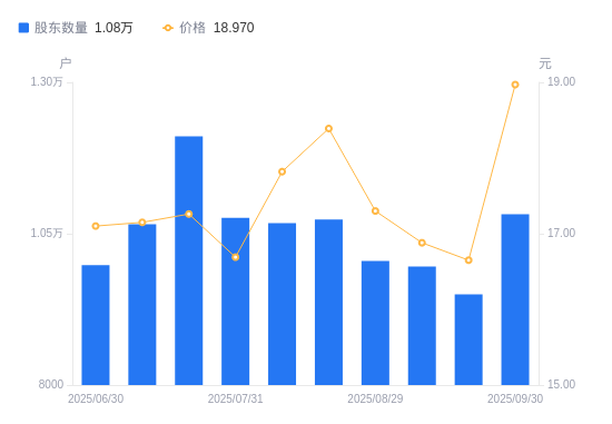 10月9日消息,数据显示,截至2025年9月30日,宁波色母A股股东总户数为1.08万户,较上期(2025年9月19日)增加1326户,增幅13.96%。公司最新A股总股本为1.68亿股,其中流通A股1.11亿股,户均持有流通A股数量为1.03万股,较上期减少1437.97股,降幅12.25%;户均持流通A股市值19.54万元,较上期减少48.65元,降幅0.02%。