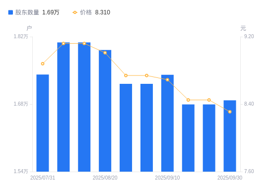 近一年(2024年9月30日至2025年9月30日),宿迁联盛A股股东户数从1.39万户,增加至1.69万户,增幅21.01%,区间股价上涨7.35%。