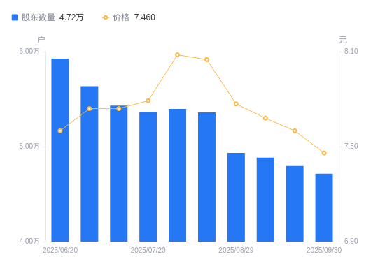 近一年(2024年9月30日至2025年9月30日),鲁北化工A股股东户数从5.99万户,减低至4.72万户,降幅21.31%,区间股价上涨11.68%。