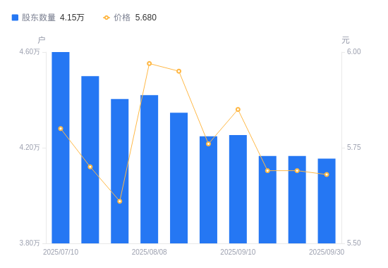 10月9日消息,数据显示,截至2025年9月30日,国际实业A股股东总户数为4.15万户,较上期(2025年9月20日)减少116户,降幅0.28%。公司最新A股总股本为4.81亿股,其中流通A股4.81亿股,户均持有流通A股数量为1.16万股,较上期增加32.22股,增幅0.28%;户均持流通A股市值6.57万元,较上期增加67.63元,增幅0.10%。