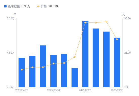 近一年(2024年9月30日至2025年9月30日),国机精工A股股东户数从3.87万户,增加至5.3万户,增幅36.80%,区间股价上涨158.89%。