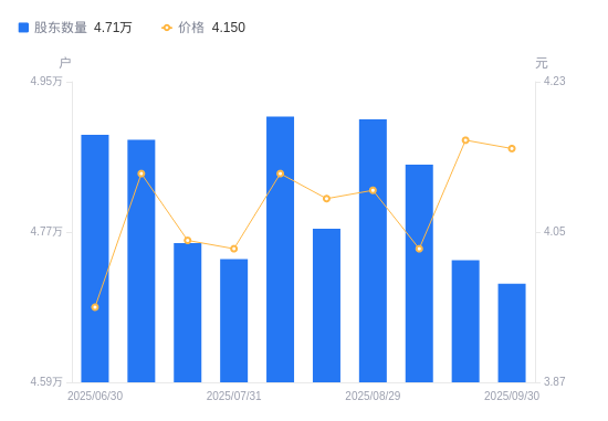 近一年(2024年9月30日至2025年9月30日),浙江交科A股股东户数从5.14万户,减低至4.71万户,降幅8.34%,区间股价上涨12.62%。