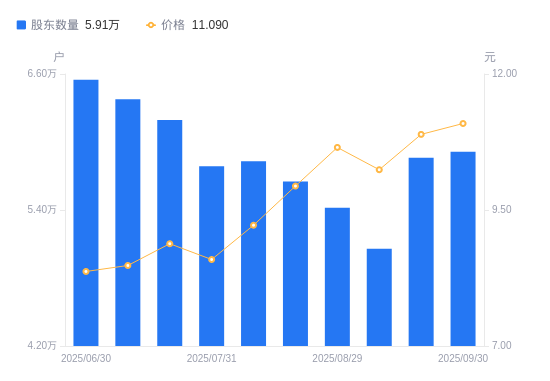 近一年(2024年9月30日至2025年9月30日),中原内配A股股东户数从5.07万户,增加至5.91万户,增幅16.55%,区间股价上涨94.22%。