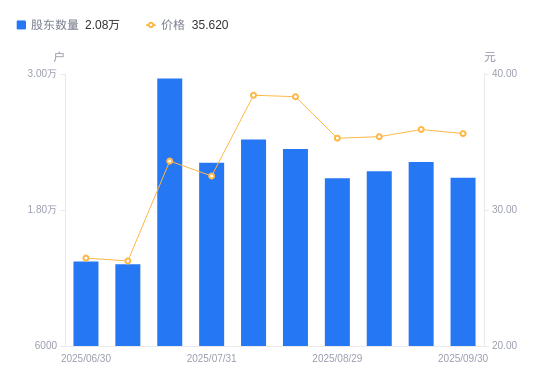 10月9日消息,数据显示,截至2025年9月30日,南京聚隆A股股东总户数为2.08万户,较上期(2025年9月19日)减少1390户,降幅6.25%。公司最新A股总股本为1.1亿股,其中流通A股8790.58万股,户均持有流通A股数量为4217.52股,较上期增加263.68股,增幅6.67%;户均持流通A股市值15.02万元,较上期增加8206.06元,增幅5.78%。