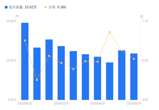 10月9日消息,数据显示,截至2025年9月30日,二六三A股股东总户数为16.82万户,较上期(2025年9月19日)减少7969户,降幅4.52%。公司最新A股总股本为13.75亿股,其中流通A股13.67亿股,户均持有流通A股数量为8124.27股,较上期增加367.4股,增幅4.74%;户均持流通A股市值5.17万元,较上期减少67.94元,降幅0.13%。