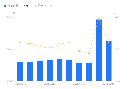 近一年(2024年9月30日至2025年9月30日),新宁物流A股股东户数从1.91万户,增加至2.75万户,增幅44.28%,区间股价上涨73.44%。