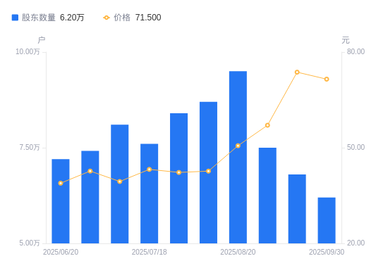 10月9日消息,数据显示,截至2025年9月30日,科华数据A股股东总户数为6.2万户,较上期(2025年9月19日)减少6000户,降幅8.82%。公司最新A股总股本为5.15亿股,其中流通A股4.55亿股,户均持有流通A股数量为7333.43股,较上期增加647.07股,增幅9.68%;户均持流通A股市值52.43万元,较上期增加3.16万元,增幅6.42%。
