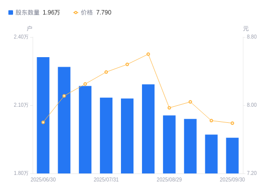10月9日消息,数据显示,截至2025年9月30日,益盛药业A股股东总户数为1.96万户,较上期(2025年9月19日)减少140户,降幅0.71%。公司最新A股总股本为3.31亿股,其中流通A股2.32亿股,户均持有流通A股数量为1.18万股,较上期增加84.14股,增幅0.72%;户均持流通A股市值9.23万元,较上期增加302.61元,增幅0.33%。