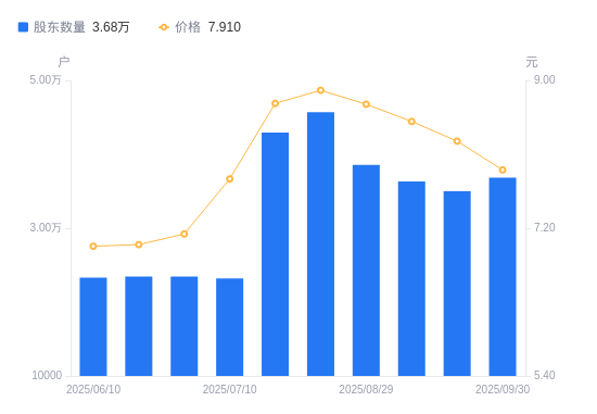 近一年(2024年9月30日至2025年9月30日),三和管桩A股股东户数从2.4万户,增加至3.68万户,增幅53.59%,区间股价上涨37.57%。