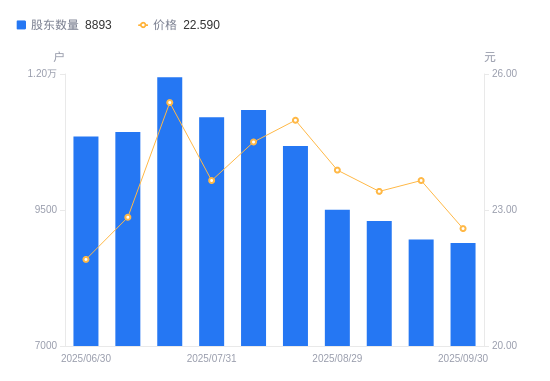10月9日消息,数据显示,截至2025年9月30日,金道科技A股股东总户数为8893户,较上期(2025年9月19日)减少66户,降幅0.74%。公司最新A股总股本为1.3亿股,其中流通A股3711.4万股,户均持有流通A股数量为4173.39股,较上期增加30.74股,增幅0.74%;户均持流通A股市值9.43万元,较上期减少3696.68元,降幅3.77%。