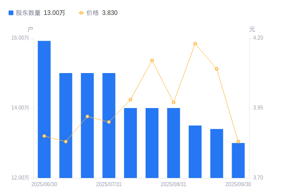 10月9日消息,数据显示,截至2025年9月30日,山东矿机A股股东总户数为13万户,较上期(2025年9月20日)减少4000户,降幅2.99%。公司最新A股总股本为17.83亿股,其中流通A股17.71亿股,户均持有流通A股数量为1.36万股,较上期增加406.68股,增幅3.08%;户均持流通A股市值5.22万元,较上期减少1878.85元,降幅3.48%。