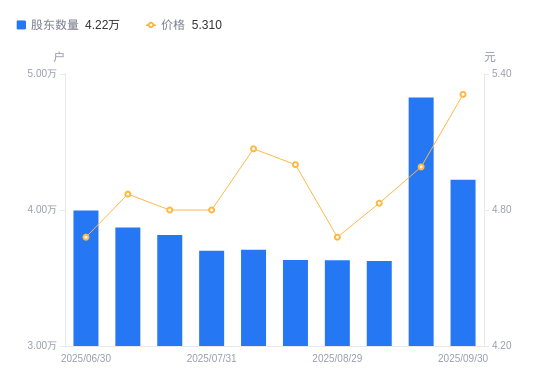近一年(2024年9月30日至2025年9月30日),德尔未来A股股东户数从3.39万户,增加至4.22万户,增幅24.69%,区间股价上涨21.79%。