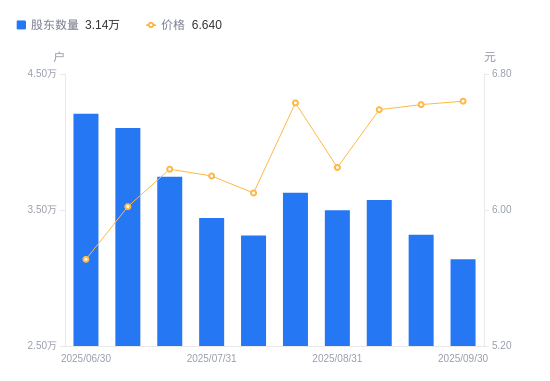 近一年(2024年9月30日至2025年9月30日),百纳千成A股股东户数从3.43万户,减低至3.14万户,降幅8.39%,区间股价上涨45.30%。