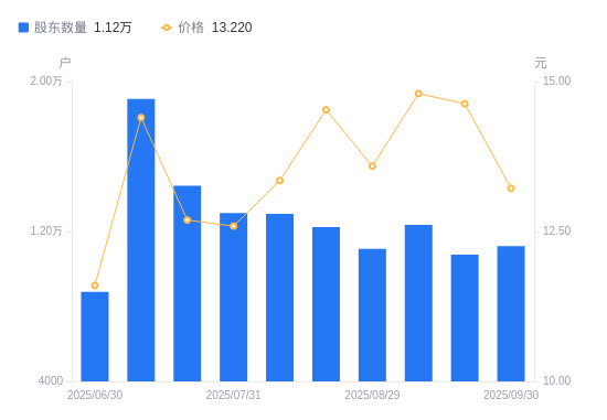 近一年(2024年9月30日至2025年9月30日),汇中股份A股股东户数从1.09万户,增加至1.12万户,增幅3.16%,区间股价上涨51.07%。
